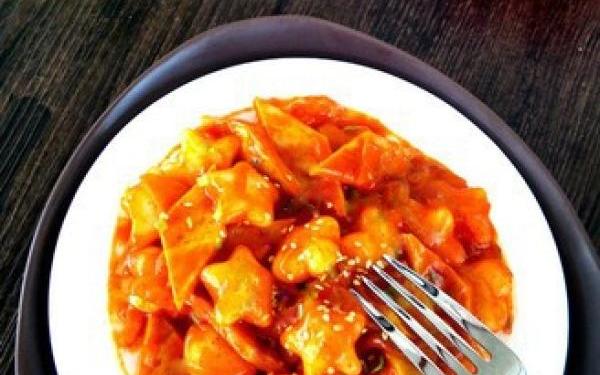 【原料】: 年糕 120g 韩式辣酱 15g【辅料】:胡萝卜 芝麻 植物油做法: 【做法】: 1.胡萝卜洗净切片,准备好韩国辣酱和年糕热锅热油。2.下胡萝卜片和年糕翻炒。 3.加入一大勺韩式辣酱加水,没过年糕,把韩式辣酱在水中拌匀中火煮年糕。 4.边煮边搅动,防止粘底。撒上芝麻。5.收汤,快速拌匀后出锅即可。