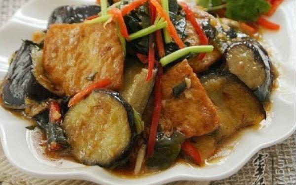 【主料】:北豆腐300克)、茄子 (100克)、海带芽 (50克)辅料、红椒 (适量)、香菜梗【做法】:1、将豆腐切成厚片,放入煎锅中煎至两面金黄。盛出控油。2、茄子洗净,切厚片,用适量干淀粉拌匀。3、放入煎锅中,煎至两面金黄,盛出控油(也可将两者放入热油中炸透)。4、红椒切丝、海带芽和香菜梗切段备用。5、锅中留底油,倒入海带丝翻炒,加老抽酱油、生抽酱油翻炒均匀。6、将煎好的豆腐和茄子一同倒入锅中炒匀。7、加入清水焖烧至汤汁浓稠。撒入红椒丝和香菜梗。加入盐、糖、素调味,最后再淋点香油即可出锅。