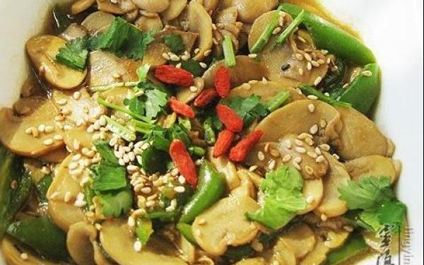 [主料]:白蘑菇、青椒、红椒、香菜、芝麻[做法]: 1、蘑菇、青椒洗净,蘑菇切成片,青椒切成菱形片。 2、锅里热油,放入蘑菇煸炒出水。 3、放入甜面酱,素蚝油和盐煸炒后闷一小会。最后再放青椒翻炒均匀,大火收汁,淋入水淀炒勾芡,撒上适量芝麻和香菜。