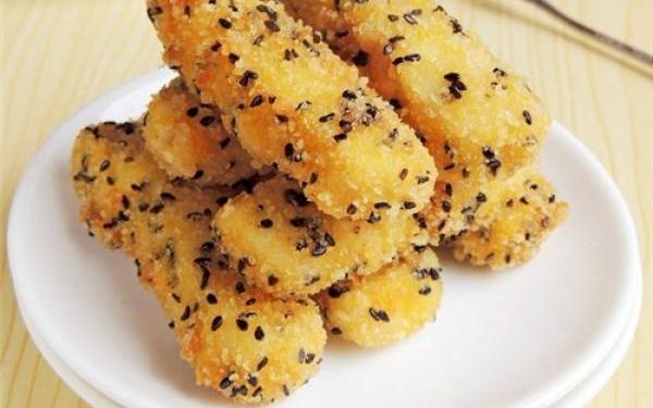 主料:豆腐500克、大豆蛋白粉2勺、面包糠100克辅料:植物油300毫升、盐1茶匙、淀粉100克、黑芝麻适量、番茄酱2汤匙炸金条的做法:1.面包糠和芝麻混合均匀,准备三只碗,分别放入淀粉、大豆蛋白粉、面包糠2.豆腐一块3.将豆腐先切成片状4.然后切成条5.锅中烧水煮沸,加入盐,放入豆腐焯水后盛出6.豆腐先裹一层淀粉,然后裹一层面包糠7.所有豆腐条做好生坯备用8.锅中放入油加热,插入一只筷子,四周冒泡时油温正好9.将豆腐条依次放入油锅中10.将豆腐条炸至表面金黄11.捞出沥油12.用厨房纸擦干净表面的油就可以啦