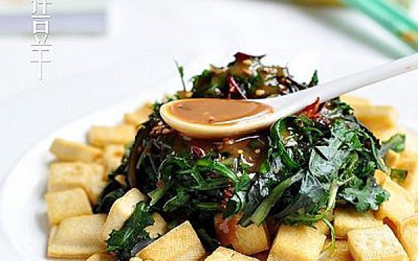 蒲公英,我们当地人叫它婆婆丁。这个菜,我们全家都很喜欢,经常挖回家,洗净,醮甜酱、凉拌生食,据说,它还是一味珍贵的中草药。性味甘、苦、寒,具有清热解毒、消痈散结、消炎、凉血、利尿、利胆、清肝热、保肝、轻泻、健胃、防癌等多种功能。 具体做法: 1、准备食材。 2、蒲公英摘去老叶和根部再次清洗干净。 3、沸水加一点点中植物油,加入蒲公英略焯十秒左右。 4、捞出后入冰水中,略浸泡换水两次。 5、三大勺花生芝麻酱加入一勺辣椒油一小勺味极鲜拌匀备用。 6、白豆干切成约1厘米的方丁。 7、锅中放少许油,入白豆干翻炒,加入约2克盐使豆干入底味。 8、炒至豆干表层微黄,