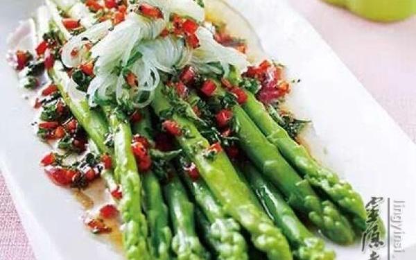 【材料】:芦笋12根、香菜1株、芹菜1根、红甜椒1/3颗、魔芋结3个 【酱汁】:砂糖少许、酱油1小匙、香油2大匙、黑胡椒粉少许、欧芹粉1大匙 【作法】: 1.芦笋去除老皮再放入滚水中汆烫过水;魔芋丝汆烫一下,备用。 2.将香菜、芹菜、红甜椒都切成碎状备用。 3.将酱汁材料混和均匀成酱汁备用。 4.取一盘放入作法1的芦笋与魔芋结,再撒入作法2的材料,最后再将作法3的酱汁淋在芦笋上面即可。
