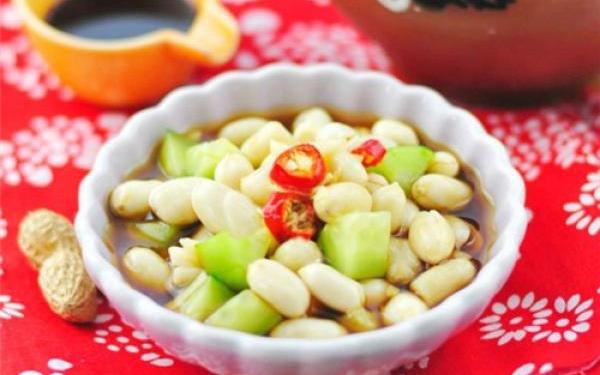 【材料】(三人份):生花生米 200g、黄瓜 1个、清水 适量、鲜红辣椒粒 少许【调味料】:老醋 3大匙、酱油 1/2小匙、香油 1小匙、白糖 1小匙、蘑菇精或味精 1/4小匙、盐 少许【做法】:1、黄瓜去皮洗净后切成小丁。2、生花生米在温水中浸泡20分钟,待表皮膨胀后用手撕去外面的红皮。3、将生花生米和黄瓜丁放在一个容器里。4、依次加入老醋、酱油、香油。5、继续撒上白糖。6、按照个人的喜好,撒少许蘑菇精或味精。7、最后加入盐、红辣椒粒,搅拌均匀。8、静置10分钟后,盛盘即可。