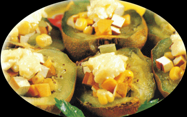 主料:主、配料:猕猴桃8只,芹菜100克,玉 米粒50克,熏干50克。 调料:无蛋沙拉少量。