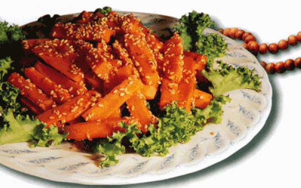 主料:胡萝卜400克,芝麻50克,生菜50克精盐5克,素油50克,白糖20克,醋15克,酱油20克。