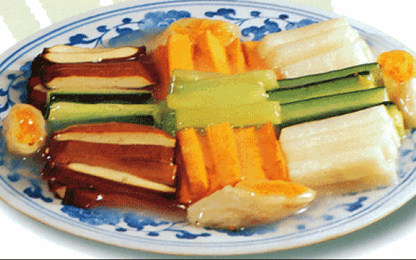 主料:主、配料:胡萝卜、黄瓜、白萝卜、五香豆腐干各100克。 调料:素油50克,精盐5克,白糖5克,淀粉20克,味精5克,芝麻油15克,姜末适量。