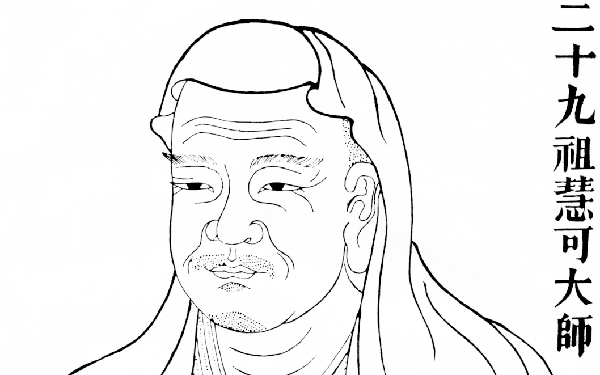 觅心不得,安心已竟。臂落峰前,续佛慧命。截上头关,全提正令。三拜而立,重添话柄。慧可禅师(487—593)又名僧可,俗名颐光,号神光,洛阳虎牢(又作武牢,河南成皋县西北)人。少为儒生时,博览群书,通达老庄易学。后来接触到了佛教典籍,便被深深地吸引。于是来到洛阳龙门香山,跟随宝静禅师学佛,不久又到永穆寺受具足戒。此后遍游各地讲堂,学习大小乘佛教的教义。三十二岁那年,慧可禅师又回到香山,他日夜打坐,希望能够借禅定的力量解决生死问题。有一天在禅定中,慧可禅师突然看到一位神人站在跟前,告诉他说:“如果你想证得圣果,就不要再执着于枯坐、滞留在这里了,往南方去吧!”禅师知道是护法神在点化他,于是将自己的名