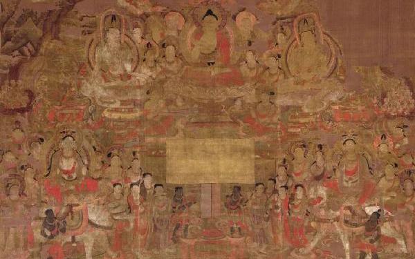 公元836年 唐代遗画绢本设色规格:152.3×177.8 cm大英博物馆收藏斯坦因敦煌绘画斯坦因收集的这幅敦煌绢画属超大型敦煌遗画之一;整幅画面共分三层;第一层为药师如来随带二胁侍和众多眷属坐于上部中央,统辖整个画面。第二层为中央黄色长方形题记的两侧是普贤和文殊菩萨,这一点可以从他们的坐骑中很容易就认出是普贤和文殊菩萨。第三层为画面底部;中央是千手千眼观音,左边伴有观音变身之一的如意轮观音,右边残缺的像,通过汉文题记可以判断是另一观音变身:不空羂索观音。整幅画面层次分明,上方药师三尊群体所乘坐的宝台、中段文殊以及普贤菩萨群体和下段三尊观音群体的分界也非常容易辨认。吐蕃时期,敦煌地区广泛流行文