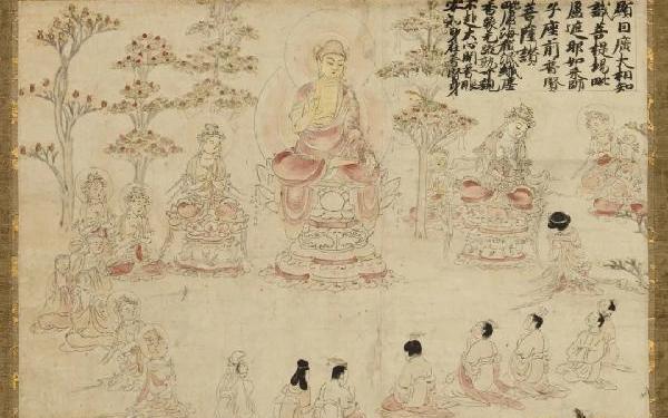 华严五十五所画卷断简纸本着色尺寸:31.7×196.6cm镰仓时代 13世纪东京国立博物馆藏此作描述了《华严经》中记录的善财童子遍参善知识的经历。故事讲述的是善财童子心地纯洁,如天空般明净,听从文殊菩萨的规劝,遍参了55位善知识(才德兼备而能指引他人的高人),终于修成正果的美丽故事。这个表现主题在大陆(即中国)、日本自古就被造型化,此绘卷继承日本的传统,于镰仓时代中期临摹了制作于平安时代至镰仓时代初期的东大寺本(分藏于东大寺及他处。东大寺所藏为国宝,其他处所藏为重要文物)中的5段。原本凭借其柔和流畅的线条及宁静的色彩,展现了极高的思想性,本临摹本虽无法媲美原本,但也可以说具有原本的余韵。各段上