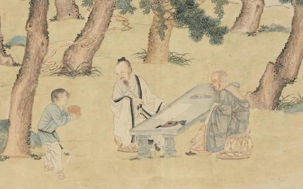 赵孟頫写经换茶图卷明代 仇英绘 文征明书手卷纸本 水墨淡彩美国克利夫兰美术馆收藏此《写经换茶图》卷由明代仇英作画,文徵明写经。画卷内容为元代画家赵孟頫嗜茶,用写心经与老友中峰明本禅师换茶的故事。此书画合璧卷是应昆山收藏家周于舜,据写《心经》换茶诗的诗意所作。仇英作画,文徵明写《摩诃般若波罗密多心经》。此卷现藏于克利夫兰艺术博物馆。画面中,有松林、竹篱,赵孟頫在石几旁作书,与明本禅师对坐。后设茶具、炉案。侍童三人。图之右前方为赵孟頫在松林树下据石几写字,似乎才将纸摊开,准备开始书写。此时赵孟頫侧身看着右前方的侍童。此侍童手上捧着一物,似为茶包,向赵孟頫和明本禅师走来。图中间松林较远处有一侍童,