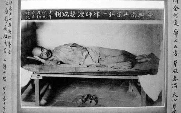 七十八年前的今天(1942年的农历九月初四)弘一大师在泉州温陵养老院晚晴室示寂大师右肋而卧 神态甚是安详 弘一大师生在秋天,也在秋天离去63年的岁月像是一场演出落幕只留下四个字“悲欣交集” 弘一法师(1880-1942),俗名李叔同,又名李息霜、李岸、李良,谱名文涛,幼名成蹊,学名广侯,字息霜,别号漱筒;祖籍浙江平湖,生于天津。从日本留学归国后,法师先后担任过教师、编辑之职。在出家前,他已是著名音乐家、美术教育家、书法家、戏剧活动家,是中国话剧的开拓者之一。 1918年农历七月十三大势至菩萨圣诞,法师于杭州虎跑寺剃度出家,法名演音,号弘一;同年农历九月,于杭州灵隐寺受具足戒。受具