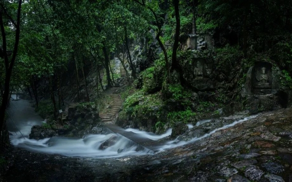 如果说冷泉独特的环境造就了其幽静的审美气象,清冷的特质塑造了其高洁的品格,那么灵隐梵境的呼应也使得其增添了一抹禅趣的味道。冷泉正好处于灵隐寺飞来峰下,它不仅仅是以自然环境的优美取胜,更在于灵隐文化的熏陶。冷泉之美,不仅仅是景美、德美,更在于境界美,因而冷泉也成为历来诗人诗歌中禅趣的象征。其中,宋代诗人赵师秀的《冷泉亭夜坐》、清代定雨的《冷泉亭迟月》以及同代诗人施闰章的《晚坐冷泉亭》是这方面的代表之作。冷泉亭夜坐宋·赵师秀众境碧沉沉,前峰月正临。楼钟晴听响,池水夜观深。清净非人世,虚空见佛心。却寻来处宿,风起古松林。赵师秀(1170—1219年),永嘉(今浙江温州)人,字紫芝,号灵秀,亦称灵芝,