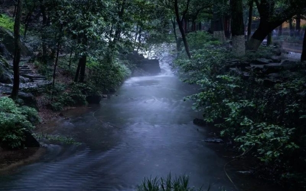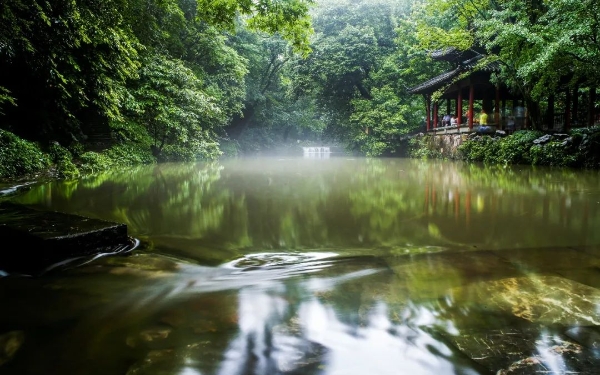 冷泉的一大特点即在于冷,冷泉之冷得源于其独特的自然风貌。冷泉周围植被丰茂,山林幽深,清冷的环境为冷泉营造了一种天然的幽静气象,这种幽静气象为历代文人所喜爱,也成为他们诗歌中经久不衰的审美趣味。历来描写冷泉的诗文中不乏对其“冷”之特性的描绘,以下仅以宋代潘阆的《酒泉子·长忆西山》和明代陈霆的《冷泉亭有作》为例。酒泉子·长忆西山宋·潘阆长忆西山,灵隐寺前三竺后,冷泉亭上旧曾游,三伏似清秋。白猿时见攀高树,长啸一声何处去?别来几向画阑看,终是欠峰峦!潘阆(?—1009)为宋初著名隐士、文人,其所作的《酒泉子·长忆西山》描绘了灵隐山秀丽的风光,传达出作者的喜爱之情。词中特别提到了“冷泉亭上旧曾游”由此