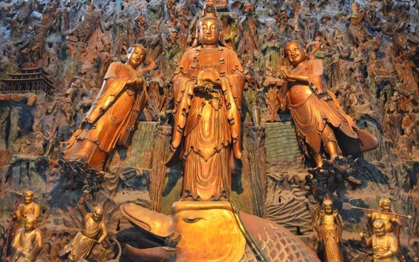 观世音菩萨,无量劫来,成就大慈大悲法门,利益众生,于生死苦海为作船筏,于无明长夜为作明灯。菩萨恒观众生称念圣号之音声,无苦不拔,无乐不与。在《法华经·观世音菩萨普门品》中,叙述了观世音菩萨救七难、解三毒、应二求、普现三十三种应化身,千处祈求千处应,苦海常作渡人舟的事迹。观世音菩萨证得耳根圆通后,为广度一切众生,而普门示现,以种种方便法,时时闻声救苦,护念救度无量众生。如经中所云:“妙音观世音,梵音海潮音,胜彼世间音,是故须常念。念念勿生疑,观世音净圣,于苦恼死厄,能为作依怙,具一切功德,慈眼视众生,福聚海无量。”九法界众生,无论是内在身心疾病缠绵,烦恼困扰,还是外在人事逼害,意外苦厄,或是生理