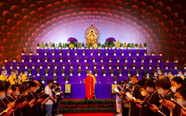 教演盂兰,舍卫之芳猷未散;功超天壤,目连之孝行常称。目犍连尊者证得六种神通后,以天眼通见到母亲因造恶业而堕落饿鬼道中,倍受煎熬。遂以神通送去白饭为母充饥,其母却因罪障深重不能食用。尊者驰往白佛,世尊为说救济之法,让他于七月十五日众僧安居圆满、举行自恣之日,集百味饭食安盂兰盆中,供养十方自恣僧,能令七世父母及现在父母在厄难中者,离饿鬼苦,生人天中,享受福乐,这就是盂兰盆会的缘起。盂兰盆者,此翻解倒悬器,以幽冥之苦,不啻倒悬,今以净器备陈佳供,仰赖三宝不可思议威德福力,能令多生父母永脱剧苦,长享安乐。癸卯年农历七月十五(2023年8月30日),乃僧团九旬结夏安居圆满之僧自恣日、佛欢喜日,也是营斋供