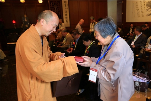 灵隐寺觉恒法师在莲灯阁接待了一行人,并表达了对浙大学生当年保护灵隐寺行动的感谢。他说:"慈悲、包容、感恩,是灵隐寺的价值理念。灵隐寺在浙大学生的保护下,很多宝贵的历史文化遗产得以保存,这正是值得我们感恩的地方。"随后,法师向各位老校友赠送佛珠,结下善缘。