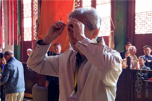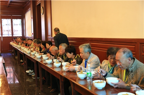 随后,老人们游览了大雄宝殿和药师殿,并在灵隐寺法师的带领下上香祈福。中午,老校友们在五观堂过堂,感受灵隐寺僧人们的生活。
