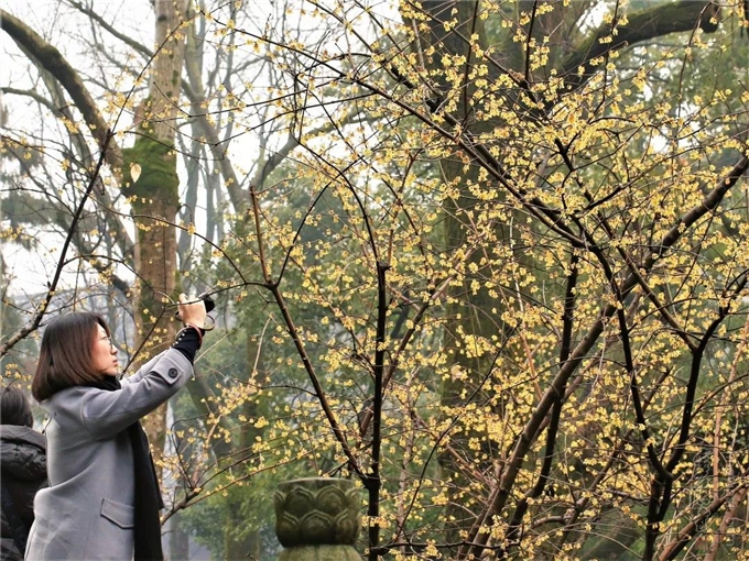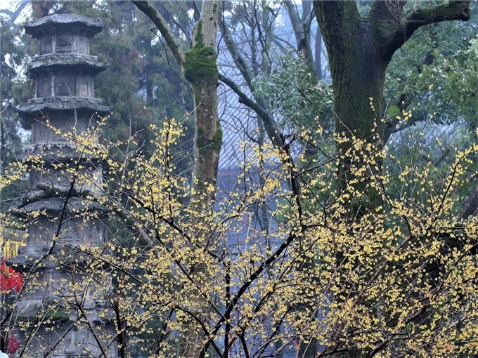 杭州灵隐寺法幢高树、海众安和。大雄宝殿西侧的数株腊梅,恰逢花令,馨香四溢,引我驻足。诗意顿起,遂赋七律一首,记此心境。