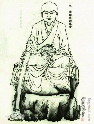 末田底迦尊者,阿难两弟子之一。印度陀颇罗人,异世五师之一。相传为阿难之最后弟子,付法藏之第三祖。末田,中之意;地那,日之意。因出家于日中之时,又因受戒于水中,故时人称为日中、水中。
