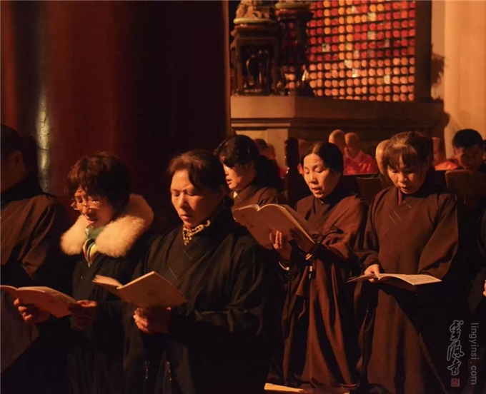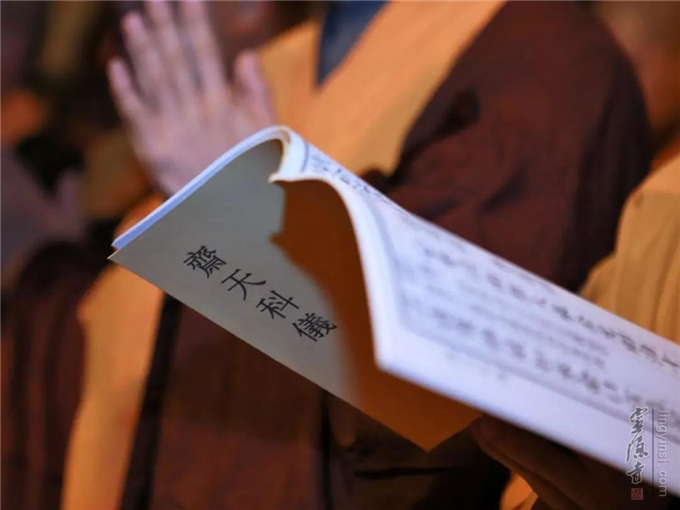 大众念《楞严咒》、《善天女咒》等。大殿的唱诵声如海涛般涌动,忽而高昂,忽而低吟,大众专制一心,用感恩心和发菩提心来作供养,表达对佛法僧三宝和护法诸天的恭敬和感恩。大众感恩护世诸天、护法神众、功德天女,摩利支天等,护佑正法、巡行人间,对杭州灵隐寺和己亥水陆道场和佛弟子的慈心护持。
