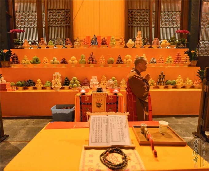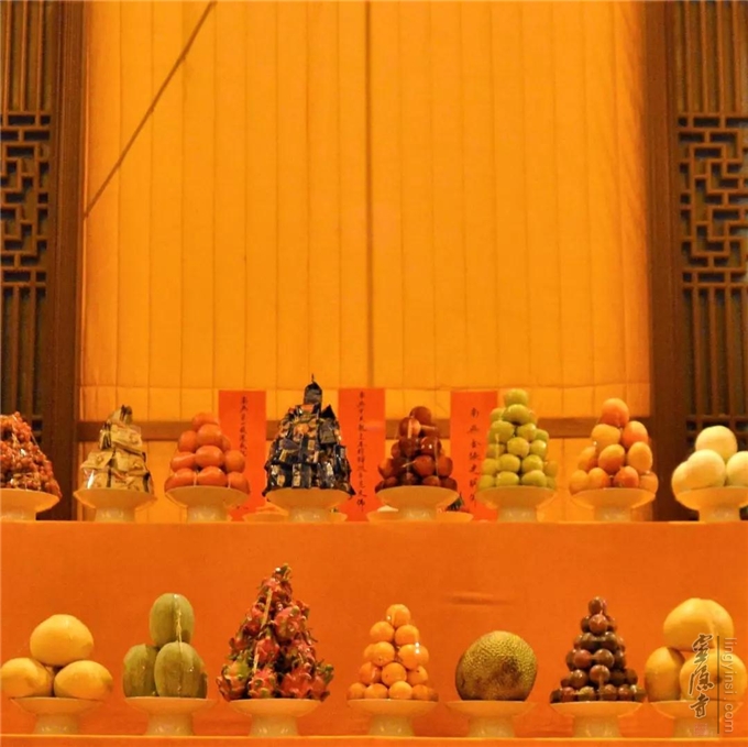 清晨4点30分,杭州灵隐寺法号声声,梵音袅绕。大雄宝殿,香烟缭绕,灯烛辉煌。水陆大坛斋天依照明末弘赞律师所撰《斋天科仪》施行。坛场所需法器和供品等,早在头天入夜前准备妥当。