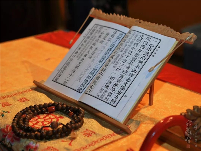 大众一心奉请十方三世一切诸佛,大乘金光明十二部经,十方三世一切菩萨、声闻、缘觉、贤圣僧;一心奉请第一威德成就众事大功德天,三十三天护世四王,金刚密迹,散脂大将,大辩天神,摩利支天,韦驮天神,坚牢地神,菩提树神,诃梨帝喃鬼子母等五百眷属,及此国内名山大川一切灵庙,当州地分属内一切鬼神圣众,灵隐寺护伽蓝神守正法者及一切圣众。请圣后,主法法师向金光明会上护法诸天座前上香三炷,顶礼三拜。