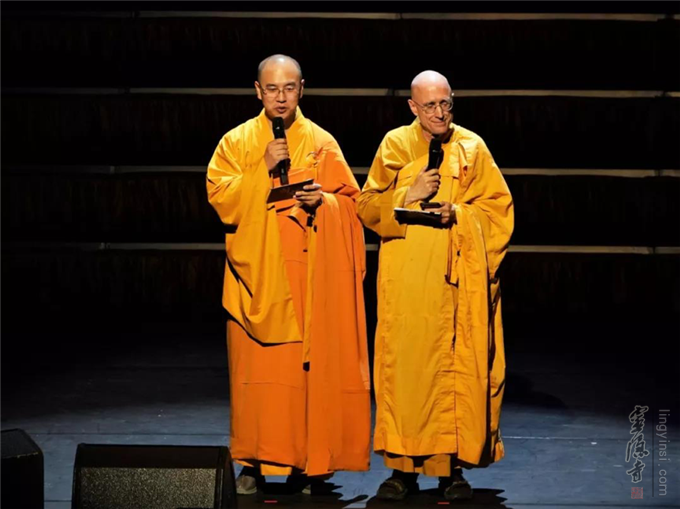 司会を担当する杭州霊隠寺の心印法師と米国の恒実法師