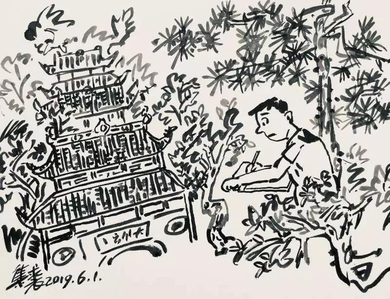那天是组织登山和游览灵隐寺。天还没有亮,队伍就出发了。我带上画画本,走在队伍的最前面。在北高峰上俯瞰灵隐寺,感觉是万绿丛中珍藏的一颗明珠,恢弘的寺院建筑特别漂亮,我就情不自禁地拿出画本画了起来……