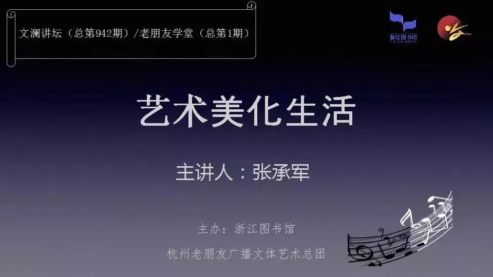 "梵音之起,由人心生。"2019年8月4日下午,由浙江图书馆与杭州老朋友广播文体艺术总团主办的文澜讲坛第942期活动在浙江图书馆二楼报告厅举行。云林志工艺术团艺术总监、著名男高音歌唱家、国家一级演员张承军教授开讲"艺术美化生活"的专题讲座。杭州人民广播电台中波AM954对此次活动进行现场直播。
