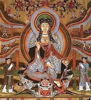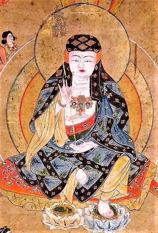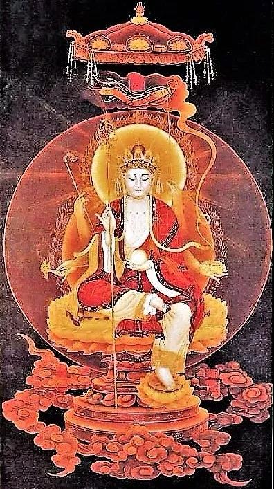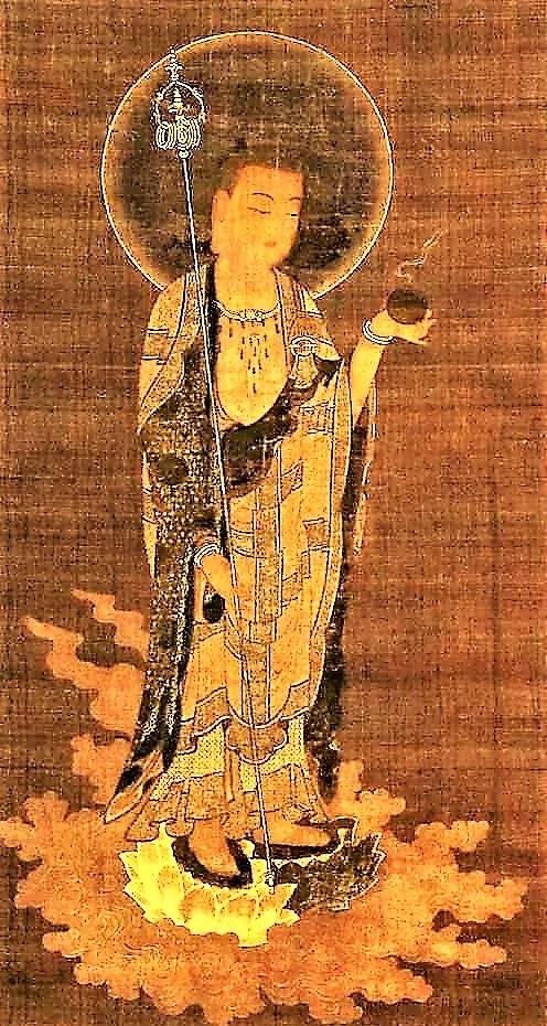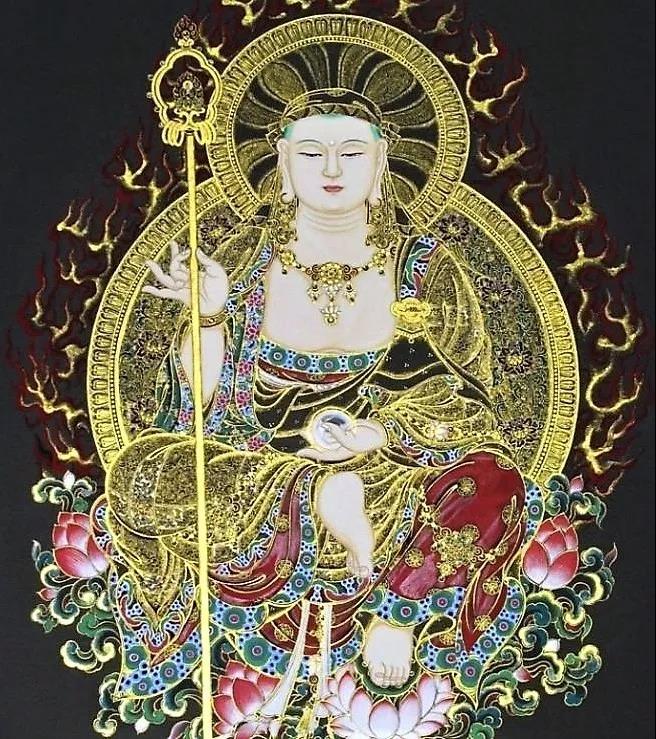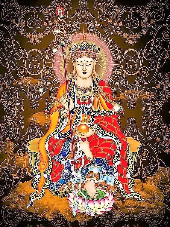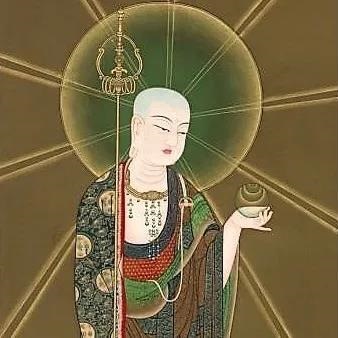 《十轮经》等云:内秘菩萨行,外现沙门形。左手持宝珠右手执锡杖,或坐或立于莲华上。