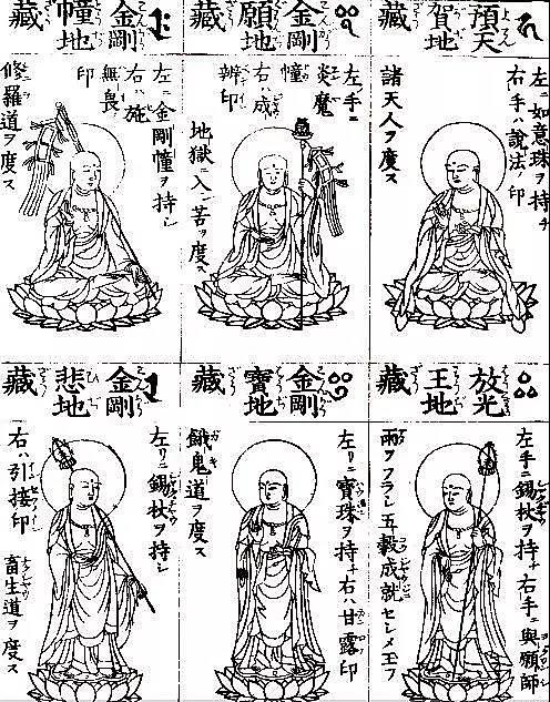 地藏菩萨在六道中普为度化,且分别示现不同身相。且六道的地藏名号也是依娑婆世界的六道众生而说,他方世界有或七道或四道等不等,地藏菩萨也依他方因缘而一一示现应化。六道地藏的名称,各经和仪轨所载不一。