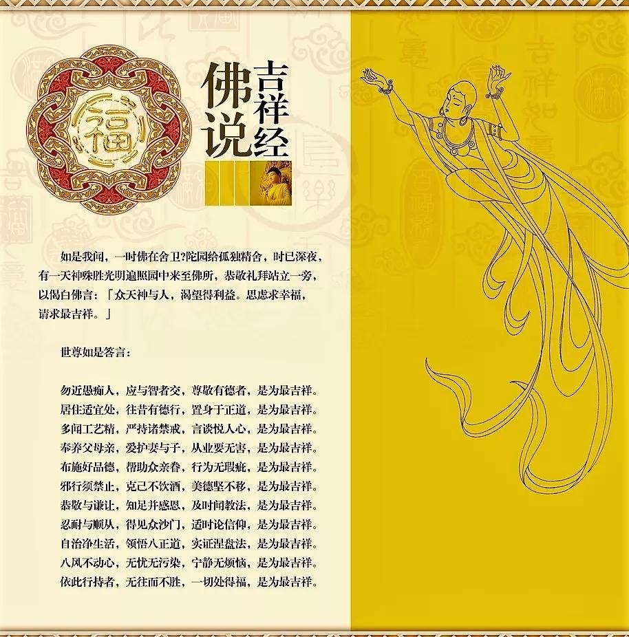 《吉祥经》出自南传佛经小部经典的小诵经部分,在南传佛教极为重视,被奉为在家人修持遵循的宝典。在汉传佛教的《法句譬喻经·吉祥品》中也收录此经。