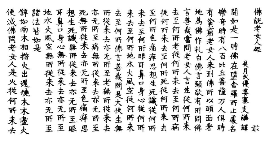 佛经里,这样的例子举不胜举,不但八岁的小女孩可以成佛道,八十岁的老太太也可以了知因缘法(有一部《老女人经》就是佛对老女人讲因缘法),中年的女人也可以直趋菩提(《大宝积经》的〈胜鬘夫人经〉就是记载胜鬟夫人发愿修行的经过,有关胜鬘夫人的故事请看今日第三条推文)。女人成道没有什么可惊,从八岁到八十岁的女人都能成道,才使我们惊奇地看见了佛教无与伦比的伟大精神。