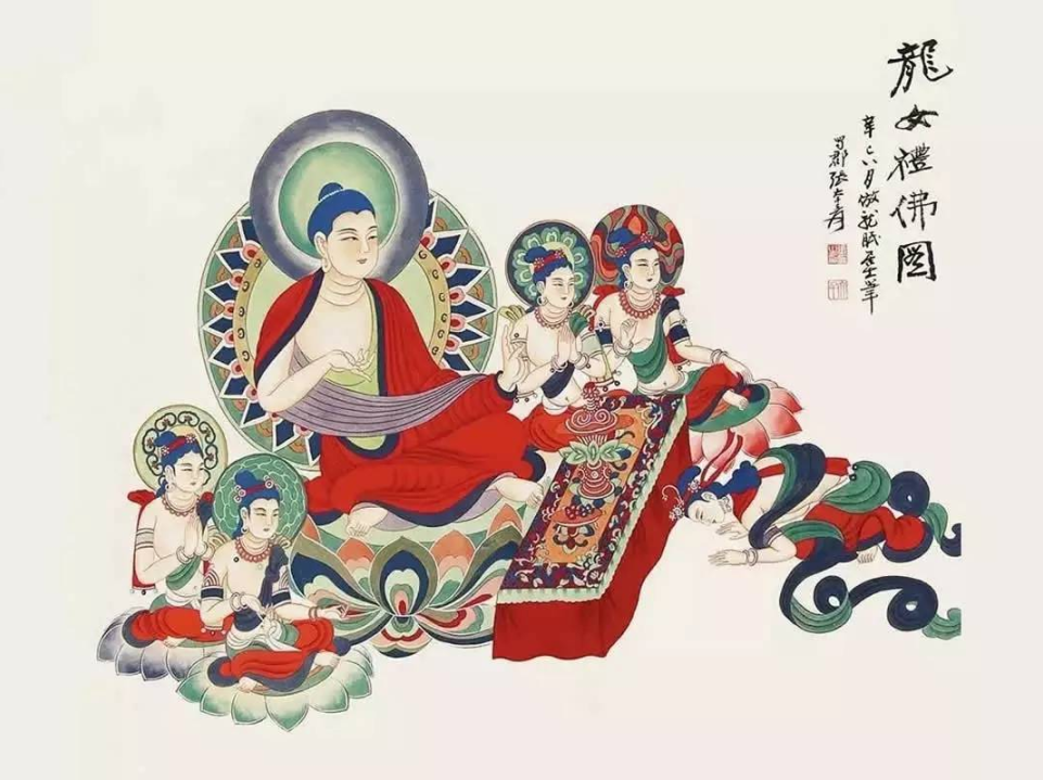 龙女说:“以你们的神通力看我成佛吧,我的成佛比这更快!”