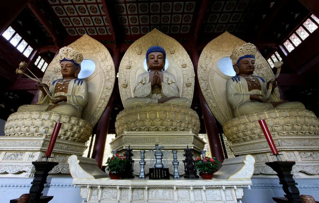 由一佛二菩萨共演大教,名为“华严三圣”。一佛是释尊的法身毗卢遮那佛,二菩萨指文殊菩萨及普贤菩萨。文殊菩萨般若自在,普贤菩萨三昧自在。文殊菩萨执掌佛的智慧宝藏,普贤菩萨推展佛的广大行愿,文殊述德,普贤启行,同辅毗卢遮那佛,教化大机众生。
