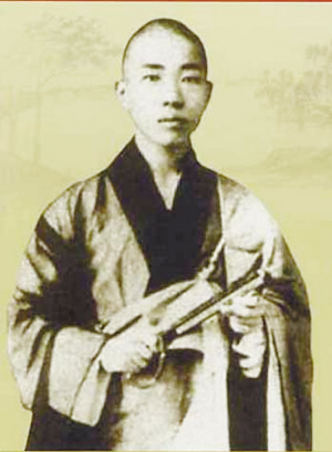 弘一(1880-1942年) 俗姓李,幼名成蹊,学名文涛,字叔同,别名甚多,如广平、息霜等,浙江平湖人,清光绪六年(1880年)九月二十日出生于天津。民国七年(1918年)农历七月十三日李叔同在虎跑定慧寺披剃出家,取名演音,号弘一。同年九月,在灵隐寺依慧明法师受具足戒。据弘一自述云:"灵隐寺是杭州规模最大的寺院,我一向是对他很欢喜的。八月底我到灵隐寺,寺中的方丈和尚很客气,叫我住在客堂后面的芸香阁的楼上,当时是慧明法师做大师父,有一天我在客堂里遇到这位法师,他就说:既然来受戒为什么不进戒堂呢?虽然你在家的时候是读书人,但读书人就能这样随便吗?就是在家时是皇帝,我也是一样看待的。那时候,我虽然不能和慧明法师常见面,但看到他那种忠厚笃实,实在令我佩服不已"。正是慧明法师通过受戒造就了一代名闻遐迩的高僧。