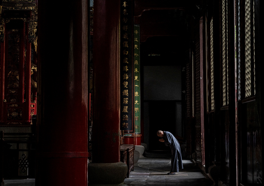中国佛教寺院中,韦陀菩萨圣像常常威武立于天王殿内,背对弥勒菩萨,面向大雄宝殿,以守护伽蓝(伽蓝即道场之意)。韦陀菩萨的形像大多为身穿甲胄的雄壮武将,手持金刚杵(又称降魔杵)。韦陀菩萨拿杵的姿势有多种,有菩萨合掌,宝杵平搁于肘间;也有菩萨手垂下来,宝杵在手掌中;也有以杵柱地,威风凛凛。这一形象的由来,还要从道宣律师说起。