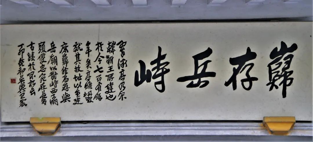 ▲“岿存岳峙”旁有小字加注:“翠微亭乃宋韩蕲王所建也,于今七百有余年矣。亭馆坍毁,就其故址重建,庶岿然尚存,与岳庙对峙。西子湖头,双忠宛在,长留古迹于不朽云。丁卯吴兴王震”。