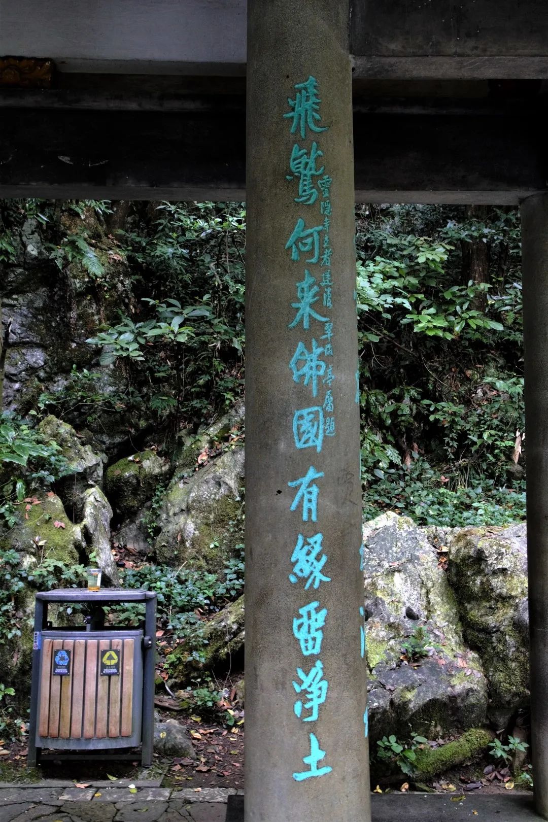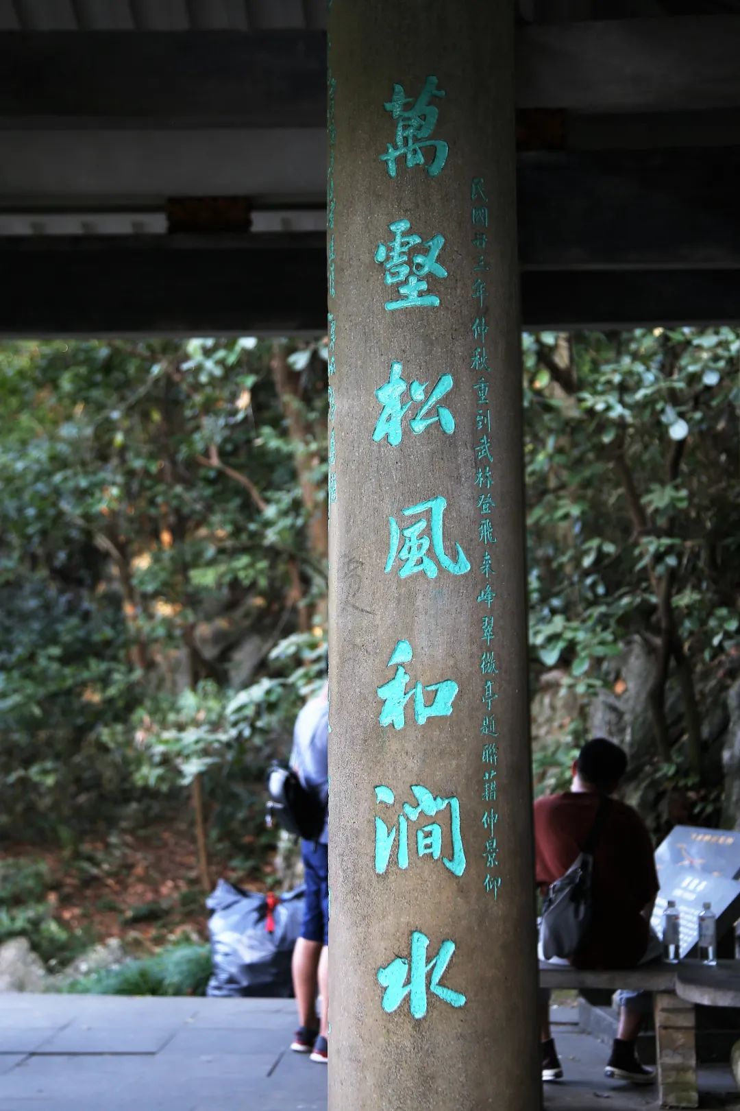 楹联有斯人已去,空有感慨的惆怅。当年的金戈铁马已随雨打风吹去,山下的溪水依然流不尽过往的岁月,只有灵隐寺的袅袅梵音,时时发出激昂的誓愿。