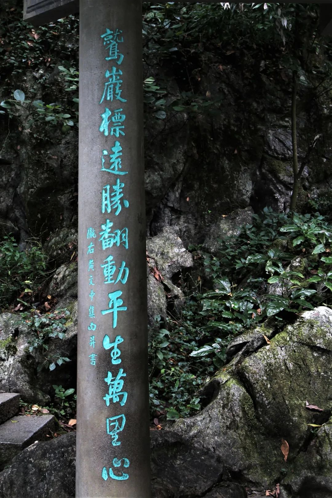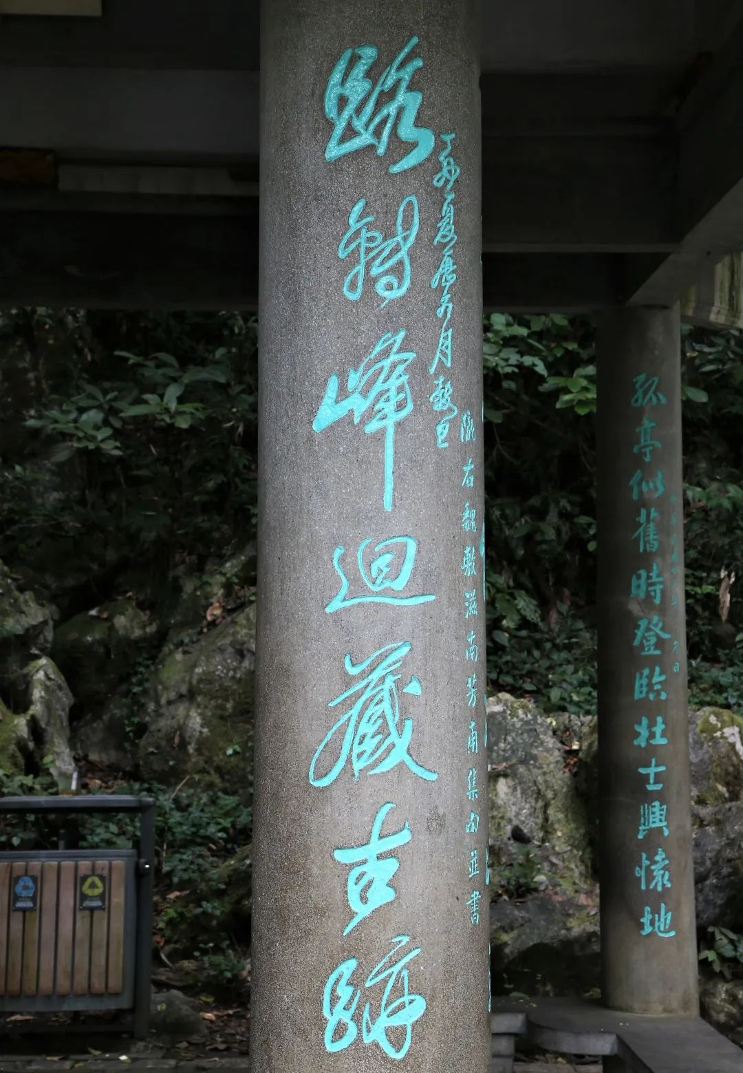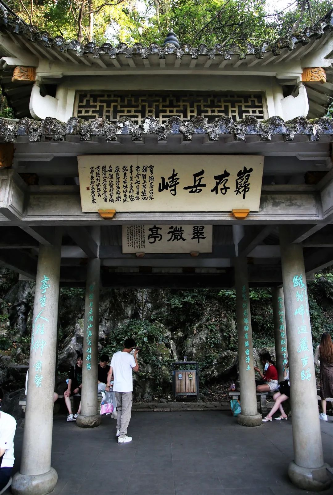 翠微亭上楹联,寓意深远,分别以不同书法刻写在八个石柱上,寄托了后人对岳飞、韩世忠的仰慕和敬意。