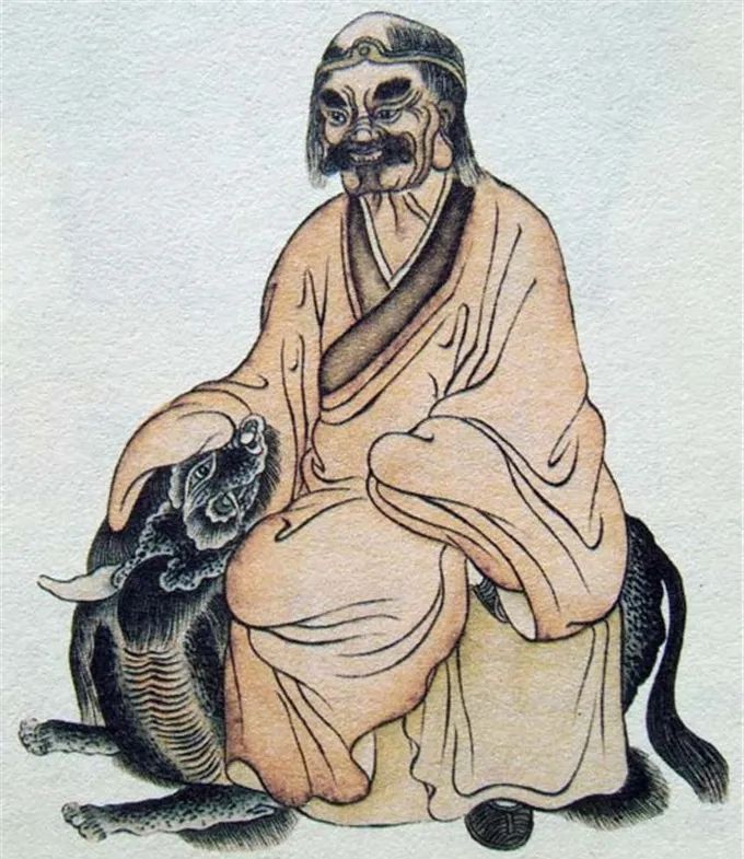 尊者法相所现为正面静坐,头戴金箍,身骑灵兽,左手抚灵兽头。
