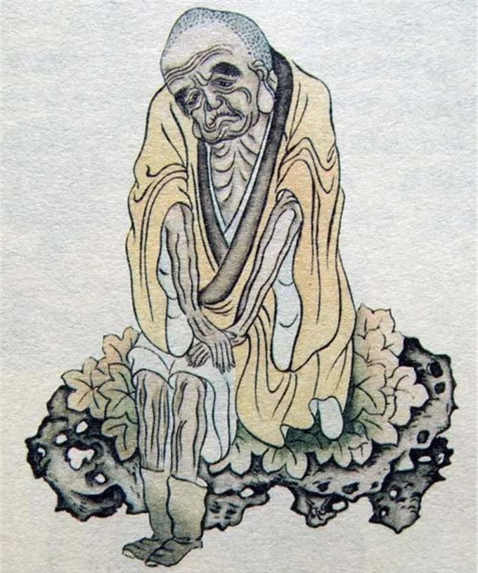 尊者法相所现为正面屈膝而坐,身材瘦削,面容愁苦,双手交叉置于左膝。
