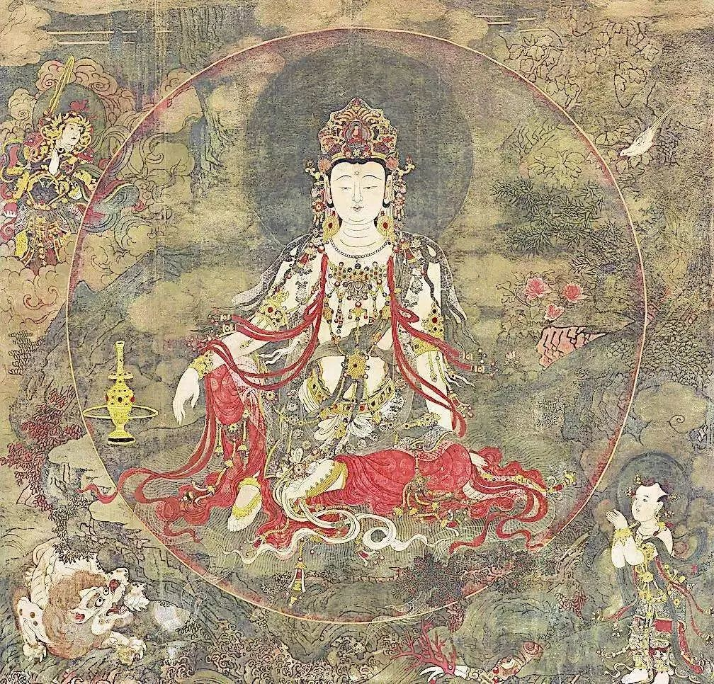 至于如今现菩萨身,在极乐世界位居补处,与大势至菩萨同辅阿弥陀佛,接引众生。并于阿弥陀佛般涅槃后,正法灭尽时,成等正觉,号普光功德山王如来。极乐世界转而名为一切珍宝所成就世界,普光功德山王如来寿命九十六亿那由他百千劫,般涅槃后,正法住世六十三亿劫(《悲华经》)。如此种种,皆是菩萨倒驾慈航方便示现的迹门,由此更可见菩萨度化众生愿力之大,悲心之深!