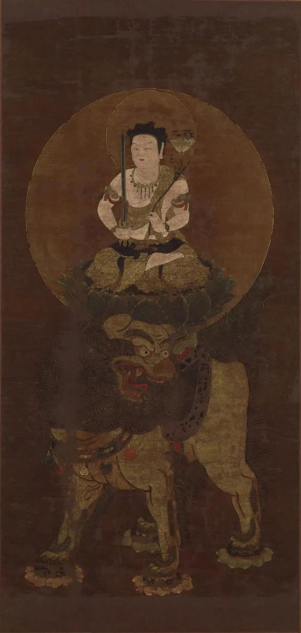 文殊菩萨的形象,通常是身紫金色,形如童子,五髻冠顶,右手握智慧剑,左手持的青莲花上放置般若经。智慧利剑能斩断种种烦恼,青莲花代表纯洁无染,花上的般若经则作为智慧的象征。菩萨常以狮子为座骑,表示智慧威猛无比;或以莲花为台座,代表清净无染;或驾乘金色孔雀,比喻飞扬自在。