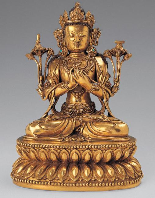 眉间毫相白琉璃色,绕身七匝,如白宝帐。身诸毛孔流出光明,如摩尼珠数,满八万四千;其一一珠宛转右旋,如七宝城优钵罗花,一一花上有一化佛,方身丈六,如释迦牟尼;一一如来,有五百菩萨以为侍者。