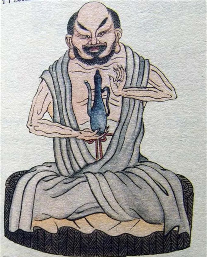 尊者曾现种种神异,以弘佛法。其右乳边有一肉孔,时常以棉絮塞之,拔除其絮,一室光明如昼。遇朔望日,至水边引肠胃涤之,复纳之入腹内,后世常有人谓信佛曰洗肠,中土称之为“洗肠罗汉”。
