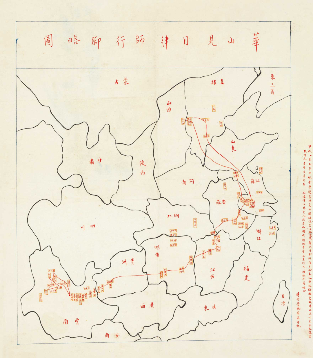 见月律师自崇祯六年(1633)起,离滇经贵州至湖南宝庆五台庵,参颛愚(观衡)。礼别后游庐山,又渡江至黄梅破头山、潜山等道场,遍礼三昧律师重修的诸祖庭。顺流朝礼青阳九华山,至南京报恩寺,闻三昧律师在五台传戒,北上参礼。但他这时因衣钵萧条,未能受戒,暂住塔院寺,阅《楞严义海》。崇祯九年(1636)离五台南行,到了镇江。第二年(1637)四月才于镇江海潮庵从三昧律师受了具足戒。从此以后,随侍三昧律师传戒诸方,开始阅读律藏,为各方所推重。