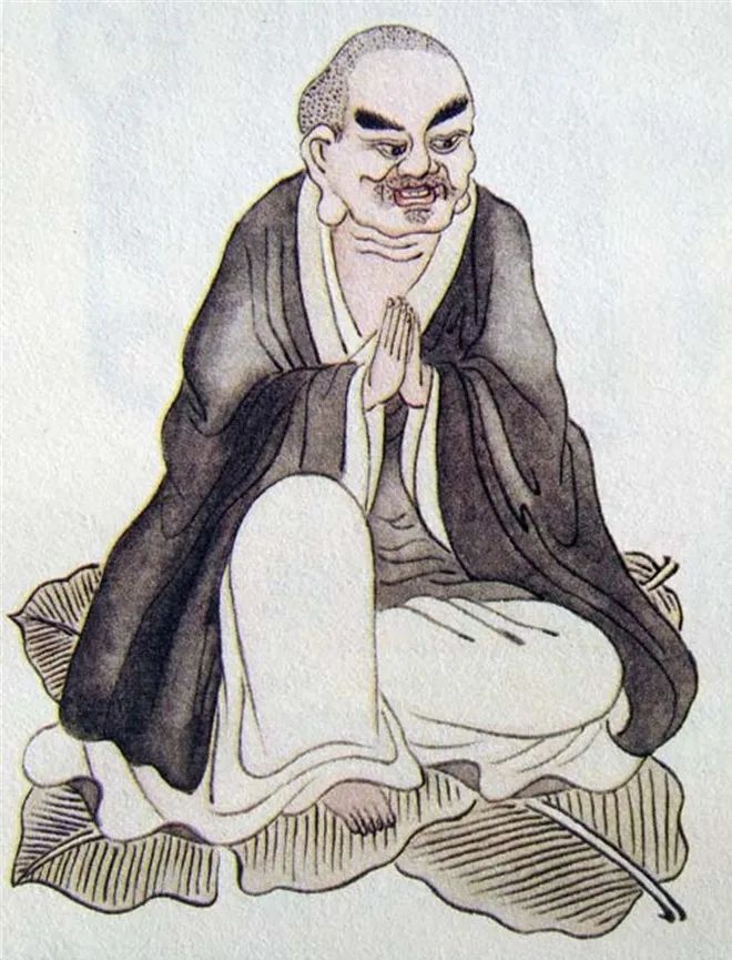 尊者法相所现为正面而坐,浓眉大耳,面露笑容,双手合十。