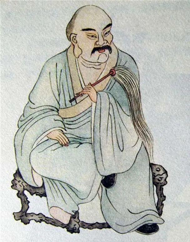尊者法相所现为正面而坐,双耳垂肩,右腿弯曲,左手持拂子。