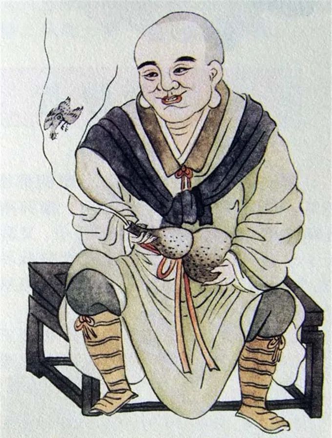 尊者法相所现为正面而坐,面露笑容,双手持宝葫芦,葫芦中化现出种种幻境。